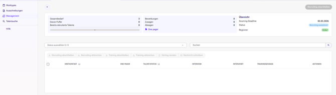 - den Sourcing‑Status (z. B. „Recruiting ausstehend“)