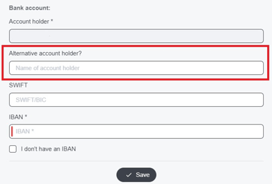 ATTENTION: Everything you enter here will overwrite the entry in the Account Holder field. As soon as something is entered here, only this information will be used for the payout. Be careful not to fill in the field accidentally if you don't need it! If there is an error here, your bank will not be able to allocate the transfer and will return it to us!