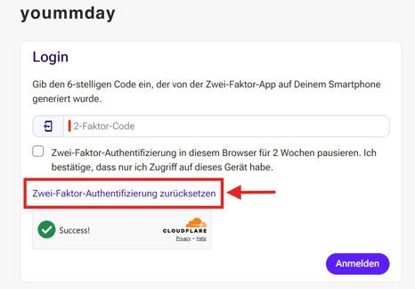 - Klicke auf “Zwei-Faktor-Authentifizierung zurücksetzen” und trage den Code ein: