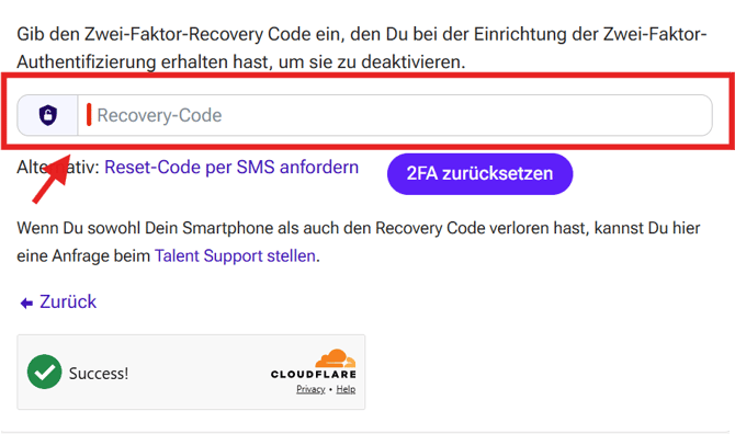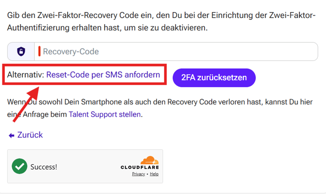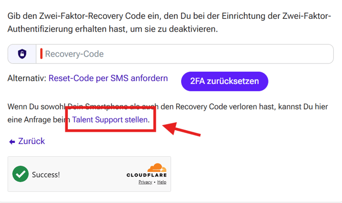 Aufgrund eines Bugs ist ein Reset über SMS oder Recovery-Code gerade nicht möglich. Bitte nutze daher, bis auf weiteres, die Option 3 – Kontakt zum Talent Support um Deinen Authenticator zurücksetzen zu lassen.