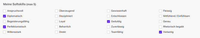 Du kannst bis zu fünf Softskills angeben, die Deine Stärken am besten beschreiben. Die Einschätzung ist rein subjektiv: Womit identifizierst Du Dich im Arbeitskontext am meisten, wie zeigst Du Dich gegenüber Kollegen und Kunden?
