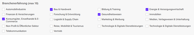 Zusätzlich kannst Du Dein Profil weiter schärfen, indem Du die Branchen auswählst in denen Du bereits Erfahrung gesammelt hast – es können bis zu 10 Stück gleichzeitig ausgewählt werden.
