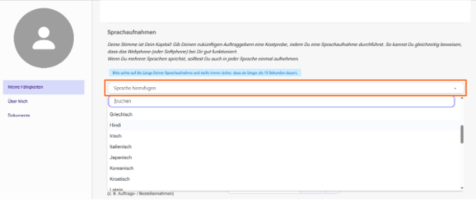 Die Sprachaufnahme ist der erste Punkte in Deinem Profil unter „Meine Fähigkeiten“.